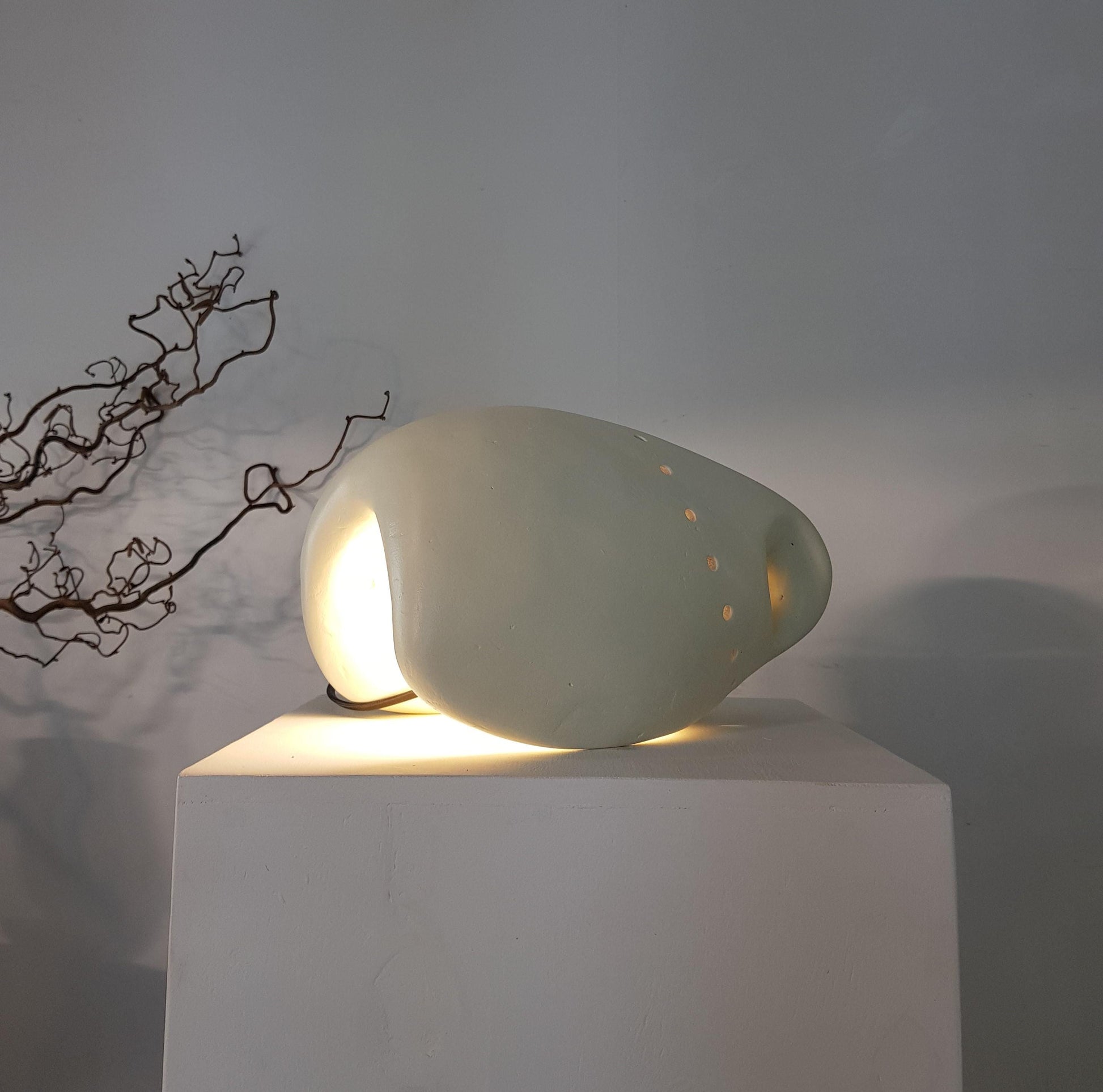 The lamp emits a soft, calming light creating a warm, ambient glow that transforms any space into a peaceful retreat. The intricate carvings allow subtle shadows to dance along its surface, enhancing its ethereal charm. Perfect for bedrooms, living rooms, or cozy nooks, this pebble-inspired lamp not only illuminates but also adds a touch of coastal beauty and artisanal elegance to any interior.